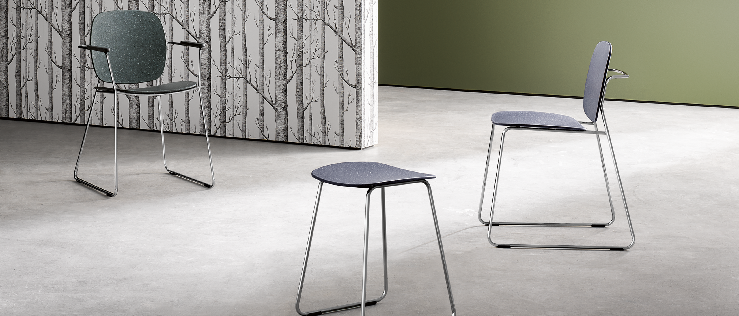Susan Herrmann: HEWI steht für Produkte, die nach Aspekten des Universal Designs gestaltet sind. Dabei stehen Funktion und Qualität in Kombination mit einem ästhetisch ansprechendem Design für uns an erster Stelle. So ermöglichen wir allen Menschen eine ideale Nutzung und garantieren über Jahre hinweg dauerhafte und langlebige Produkte. Als Experte auf dem Gebiet der Kunststoff- und Spritzgusstechnik setzen wir uns bereits seit Langem mit der Wiederverwendung von Kunststoff auseinander und haben uns daher die Frage gestellt: Wie können wir das Material, das im Rahmen unserer Produktion zusätzlich anfällt, nutzen und ein neues Produkt daraus herstellen? Bisher ist es tatsächlich eher unüblich, dass man in der Produktion anfallendes Material upcycelt und dann in der sichtbaren Oberfläche eines neu entstandenen Produktes verwendet. Für uns war es bei diesem Projekt natürlich wichtig, ein Produkt aus einem recyceltem Material herzustellen, das den hohen Qualitätsansprüchen, die wir und auch unsere KundInnen an unsere Lösungen stellen, entspricht. Für uns ist ein solches Material das Post-Industrial Rezyklat, das wir für die Re-Sitzfamilie verwenden. Die Sitzmöbel bestehen dabei aus einem Materialgemisch aus rezykliertem Polypropylen und rezykliertem Polyamid. Letzteres entstammt aus der HEWI Produktion, während wir Ersteres von einem regional ansässigen Unternehmen beziehen.