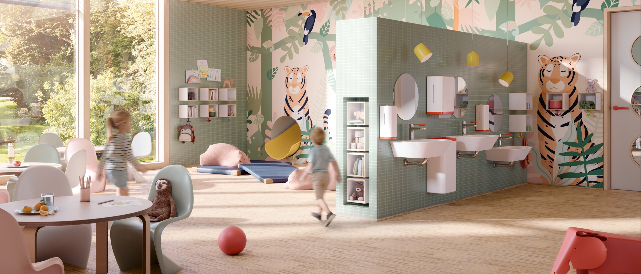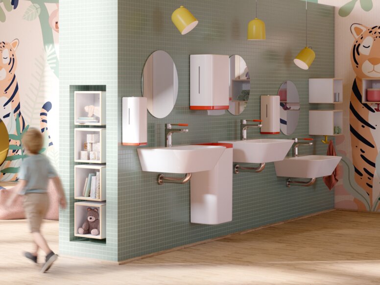 Vollständig ausgestattet sind Sanitäranlagen in Kitas und Kindergärten mit weiteren Spenderlösungen, z. B. für Papier und Mülleimer. Abgerundete Kanten und farbige Rahmenelemente sorgen für mehr Sicherheit und setzen stimmige Farbakzente.