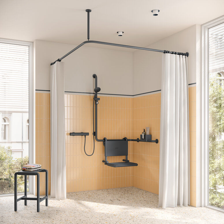 Mobile Badstühle und Hocker bieten Ihren KundInnen Flexibilität und Unterstützung dort, wo gerade Bedarf ist. Die Produkte unserer Sitzfamilie bestechen durch ihre moderne Formensprache und ihre cleveren Zusatzfunktionen. Neben Stühlen mit einer integrierten Handtuchreling und Haltemöglichkeiten ist ein Modell mit Armlehnen verfügbar, das den Komfort und das Sicherheitsgefühl in der Dusche steigert.