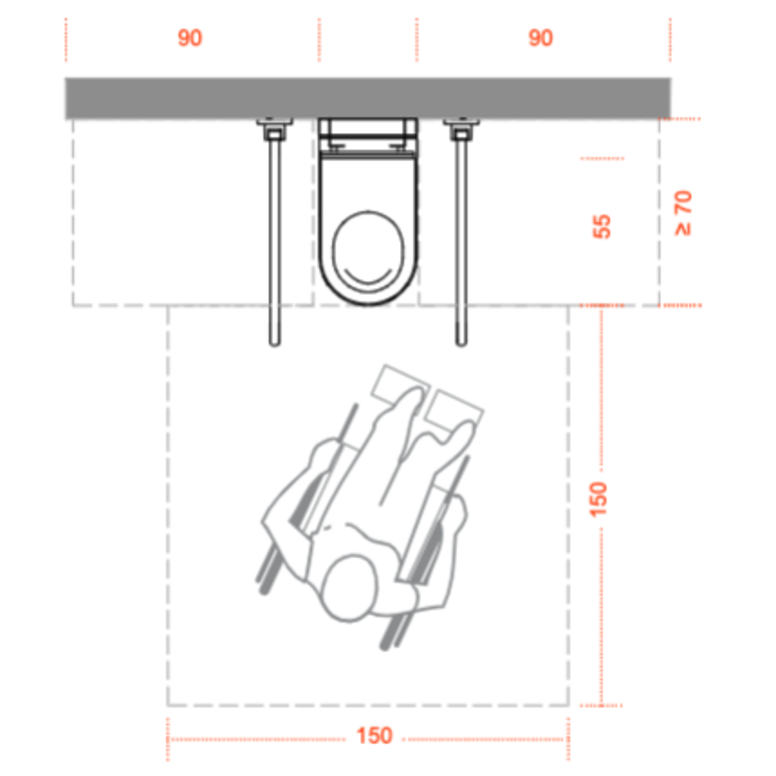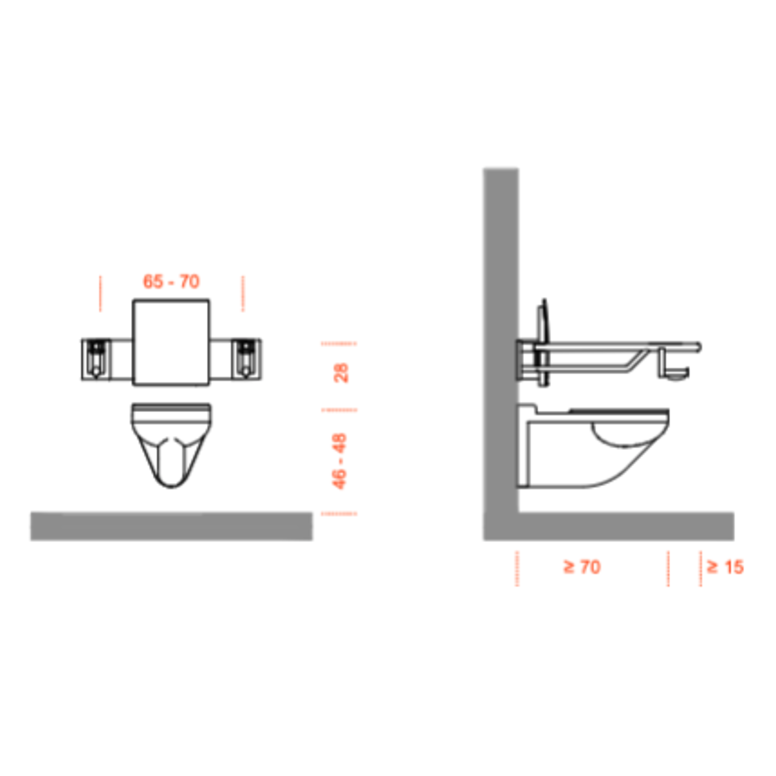 - Höhenanforderungen: Die Norm schreibt eine Sitzhöhe von 46 bis 48 cm vor, um die Nutzung von Rollstühlen zu erleichtern und den Transfer zwischen Rollstuhl und WC zu unterstützen.