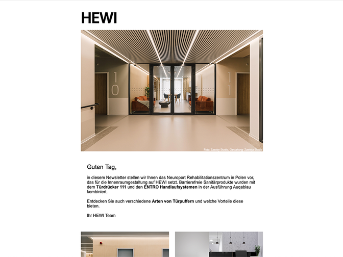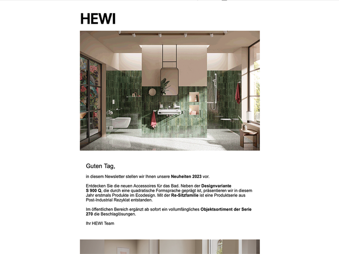 Der HEWI Newsletter informiert Sie themenbezogen zu Neuigkeiten rund um Produkte, Services und Veranstaltungen. Teilen Sie uns mit, welche Schwerpunkte Sie interessieren und wir stellen die passenden Themen für Sie zusammen. So erhalten Sie Ihre Exklusiv-Informationen noch vor allen anderen!