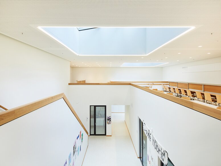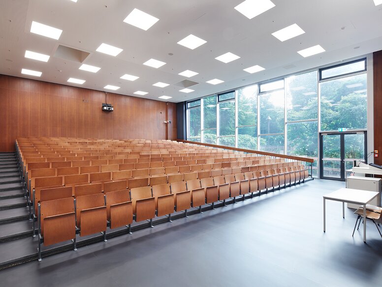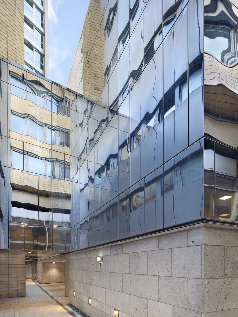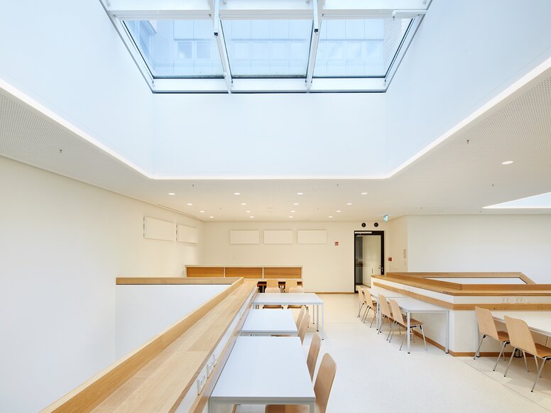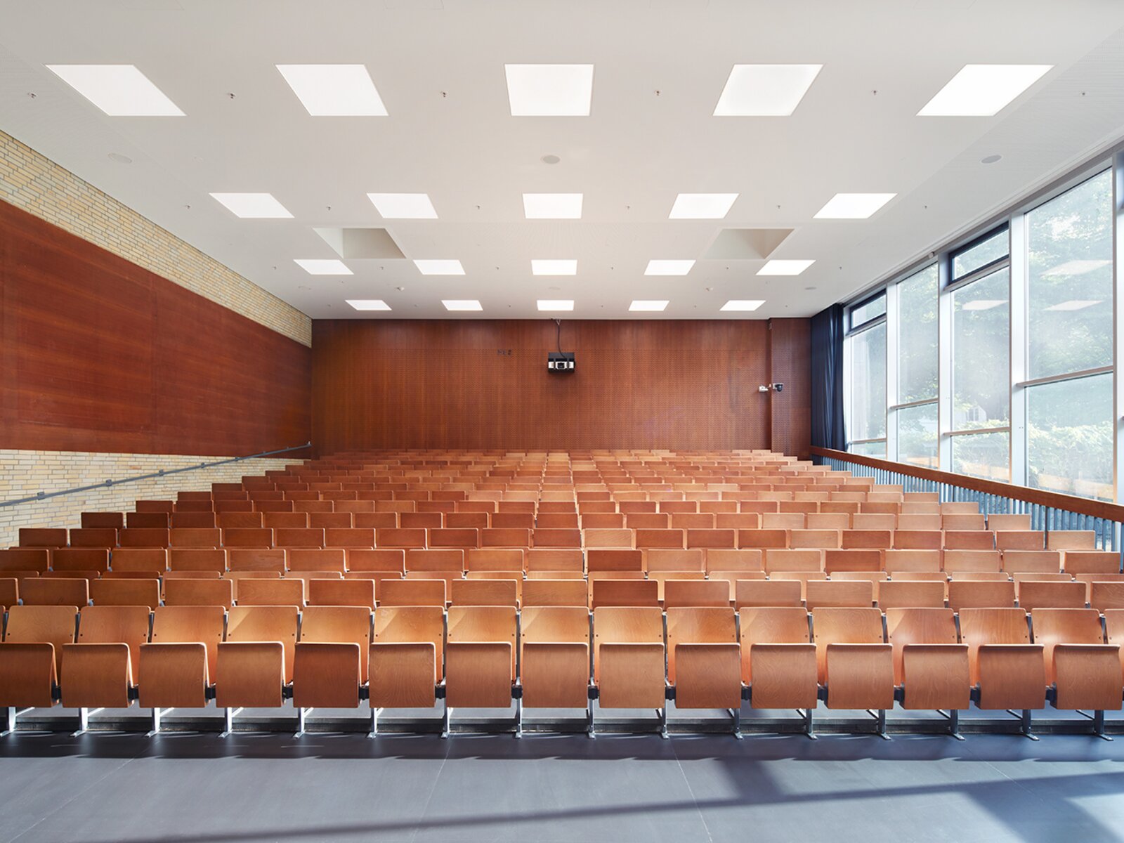 Neben der Sanierung des Bestandes sollten die Nutzflächen erweitert werden. Der neu entstandene „Cube“ staffelt sich als freistehender Solitär im Innenhof über drei Geschosse und schafft auf rund 900 Quadratmetern Raum für zusätzliche studentische Arbeitsplätze und den Austausch zwischen den Fachschaften. Der neue Erweiterungsbau zeichnet sich durch eine polierte Edelstahlfassade aus, die durch ihre reflektierenden Eigenschaften interessante Effekte und Blickbeziehungen schafft. Die Fassade trägt zu einem harmonischen Zusammenspiel von Alt und Neu bei, indem sie die historische Fassade spiegelt und sich optisch zurückhaltend und zugleich modern präsentiert. Im Obergeschoss des Neubaus befindet sich ein lichtdurchfluteter Saal, der zusammen mit den vier Seminar- und Gremienräumen im Erdgeschoss auch für Veranstaltungen genutzt werden kann. Der Neubau verbindet sich im Erdgeschoss an drei Seiten über Brücken mit dem Bestand. Neu geschaffene Besprechungsräume im denkmalgeschützten Hauptfoyer sowie die generalsanierte Mensa mit offenem Raumkonzept und neuer energieeffizienter Haustechnik ergänzen die Nutzungen im Erdgeschoss.