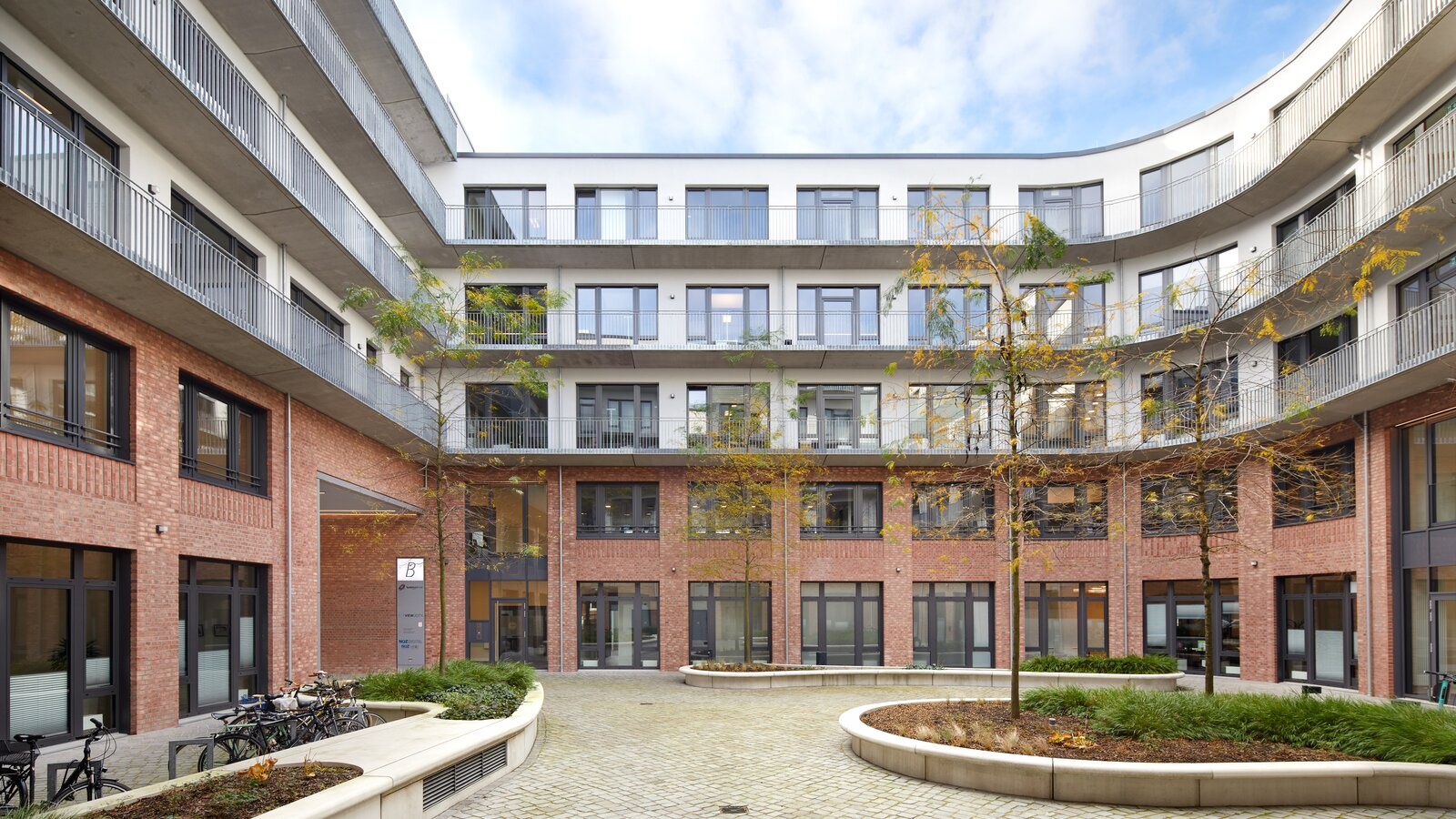 The reddish-brown clinker brick façade on the street side and the regular arrangement of the windows with a recessed parapet, which is emphasised by a special clinker brick decorative element, are reminiscences of the classic industrial architecture in the former industrial district of Ottensen.