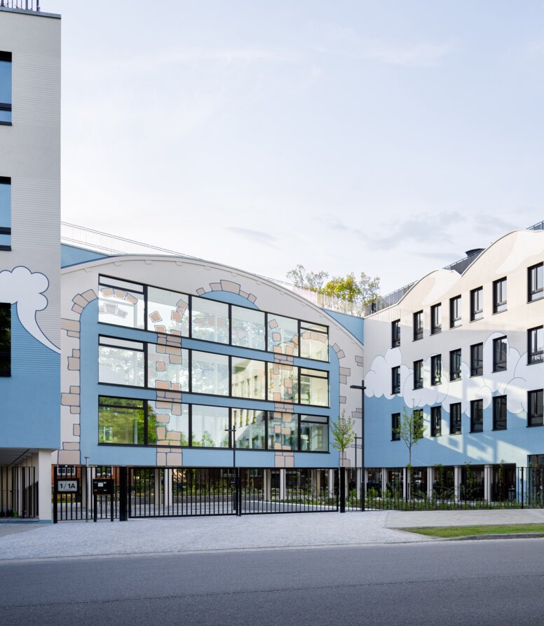 Colourful kindergarten equipped with HEWI fittings, cloakroom and furniture