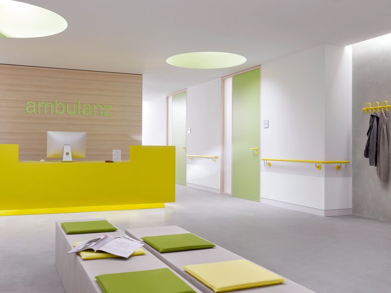 White hospital room with two orange doors fitted with a lever handle in the colour grey made of polyamide