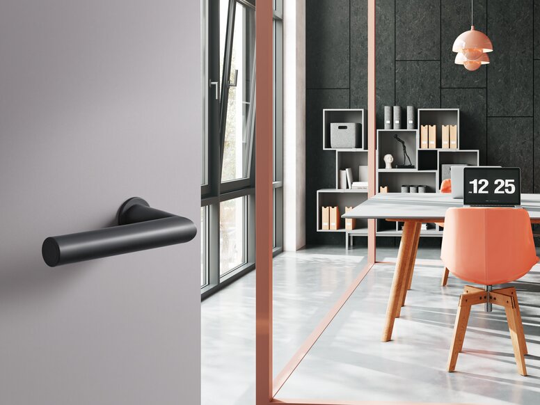 Office building door fitted with a black lever handle
