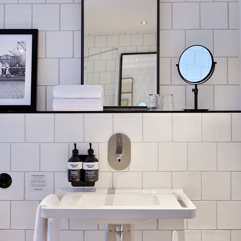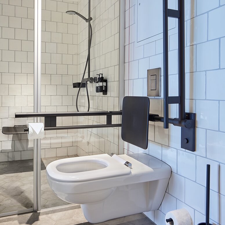 Zwarte bouw- en designelementen lopen als een rode draad door het ontwerp van het hotel. HEWI System 900 oplossingen integreren harmonieus in hotelbadkamers en barrièrevrije sanitaire ruimten.