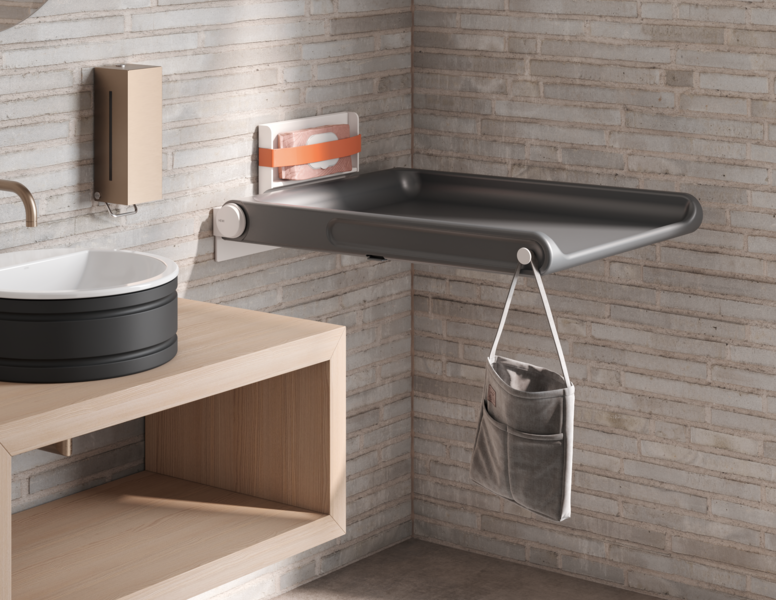 De nieuwe HEWI babyverschoontafel combineert een makkelijk te reinigen ligoppervlak van PUR-schuim in ijzergrijs met robuuste metalen componenten in korrelwit mat. De geremde neerklapfunctie maakt soepel gebruik mogelijk, terwijl zijhaken en een klemvak extra gemak bieden. De verschoontafel combineert de hoogste veiligheidsnormen en gebruiksgemak met een modern ontwerp dat naadloos past in openbare sanitaire ruimtes. De babyverschoontafel is ontworpen door Holscher Design, een gerenommeerd en veelvuldig bekroond bureau voor strategisch productontwerp uit Denemarken met meer dan 50 jaar ervaring.