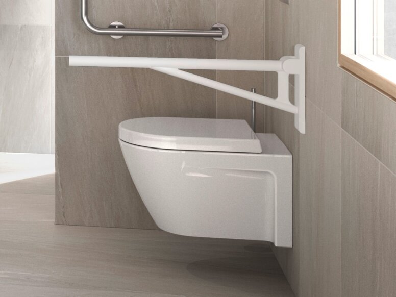 Handgrepen met scharnieren moeten ook aan beide zijden van het toilet worden aangebracht. De bovenkant van de opklapbare steungreep op het toilet moet 28 cm boven de zithoogte zitten. Het wordt ook aanbevolen dat de opklapbare steungreep 15 cm voorbij de zitting uitsteekt. Een vrije afstand van 65 tot 70 cm tussen de handgrepen wordt aanbevolen. Deze waarden zijn bedoeld voor de publieke sector. In privéwoningen is het belangrijk dat opklapbare steunrails achteraf kunnen worden aangebracht. Het installeren van een geschikte montageplaat bij het plannen van een nieuwe badkamer of het renoveren van een bestaande is een belangrijke beslissing voor de toekomst.